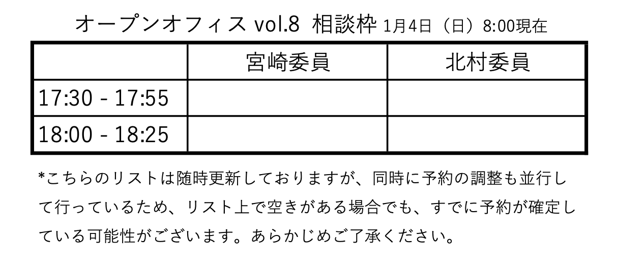 大阪アーツカウンシルでは、令和8年1月13日(火)に、文化芸術関係者の皆様のご相談などに応じるオープンオフィスを開催いたします。会場にて下記の時間に大阪アーツカウンシルの委員2名(宮崎・北村)がお待ちしておりますので、何かございましたらどうぞお気軽にお訪ねください。