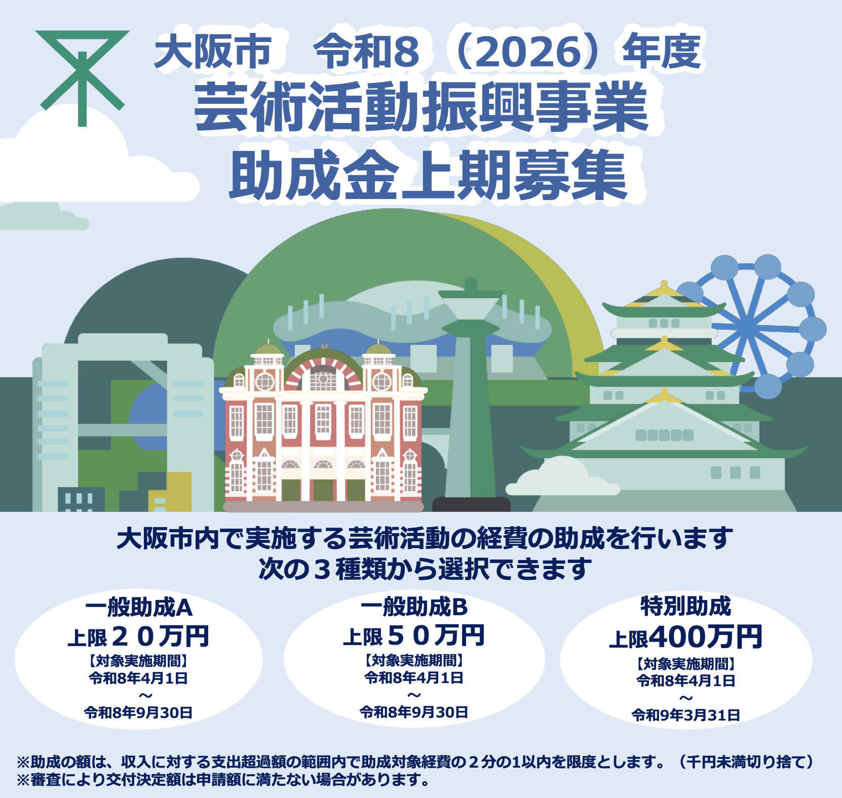 大阪市では、市民等が多様な鑑賞・体験機会を生む創作・表現活動を支援し、文化の向上と創造的な芸術活動の発展を図るため、「大阪市芸術活動振興事業助成金」を交付します。本助成金は、個人・団体が大阪市内で実施する芸術活動を対象に助成し、その活動実施に係る経費の一部を支援するものです。